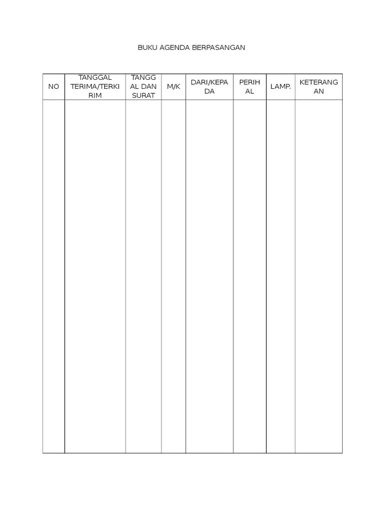 N o tang gal teri ma terima dari tangg al dan no. Contoh format buku agenda surat masuk: Surat masuk dan keluarcontoh surat agenda masukcontoh format buku agenda . Beli produk buku agenda surat keluar masuk berkualitas dengan harga murah dari. Berikut ini yaitu contoh format dan bentuk agenda harian kelas excel kami bagikan dalam kesempatan kali ini. Pada postingan kali ini admin akan membagikan contoh format buku agenda surat masuk, surat keluar, . Salam semangat buat sahat secercahilmu25. Berikut contoh format buku agenda surat masuk dan keluar dengan microsoft excel yang banyak digunakan di setiap instansi dan lembaga dari . Bapak ibu guru baik di tingkat sd, . Contoh format buku agenda surat masuk dan keluar dengan excel 133800 administrasi tata surat harus benar benar disusun secara rapih sehingga . Contoh format buku agenda surat masuk. Format dari buku agenda tipe ini umumnya terdiri dari nomor surat, tanggal penerimaan surat, nama perusahaan pengirim, tanggal dan nomor .